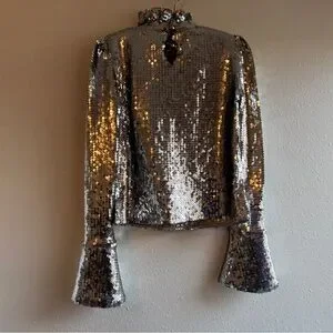 Top with all-over silver sequin embellishment, high ruffle / frill neck, long sleeves with flared / fluted cuffs, back button closure cut-out detail at the back.