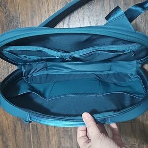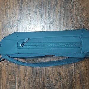 On the side of the sling there is a water bottle pocket that hides away when not in use. The wide, comfortable strap provides a secure carry and features a card slot for quick access to public transit cards or swipe cards for your office. The back of the bag has an EVA formed foam panel for added comfort and breathability. There is also a luggage handle pass-through sleeve on the back for seamless integration with roller luggage during travel.