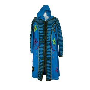Standout boho hippie-style long hooded jacket in bright turquoise blue with unique cutout/ribbon appliqué details and multicolor embroidered floral accents. Features a zip front, long sleeves with slashed cutouts, and mid-length fit. A true statement piece for festivals, concerts, or everyday eclectic style. Two small spots on back shown in photos otherwise in great condition.