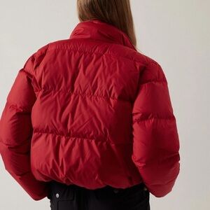 Stylish red puffer jacket. Warm and comfortable. Perfect for cold weather.