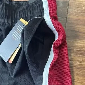 Dynamic black shorts with striking red side panels. Ideal for sports and casual wear. Has pockets