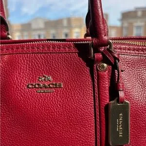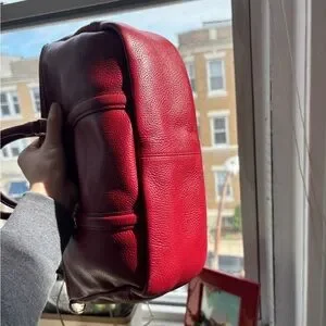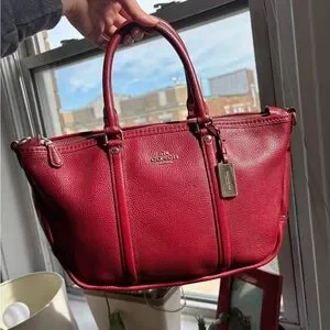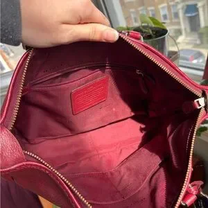 This Coach handbag is in excellent condition and is truly stunning in cherry red soft pebble leather and gold hardware. Comes with detachable long strap. Has 2 small pockets and 1 large zipper pocket. All zippers and clasps function. Only flaw is small stain on inside (see photo, it is a light spot below storypatch). Otherwise it is in perfect condition! Offers welcome ❤️