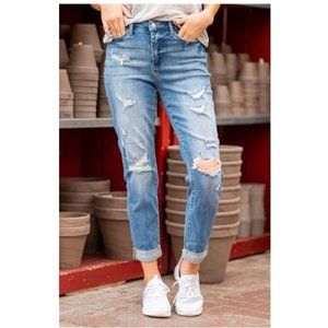 These are the Anniston High Rise Boyfriend Fit distressed jeans from Judy Blue. Model photo shows the jeans rolled at the hem, but you can wear them unrolled.