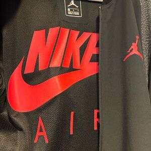 Stylish Jordan jacket in black and gray with a striking red logo. Perfect for casual wear.