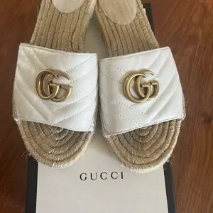 Elegant Gucci espadrille sandals. Cream leather with iconic gold logo. Perfect for casual elegance.