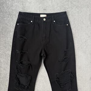 Heavy distressed/ripped design throughout front and back with shredded/frayed hem and pocket accents