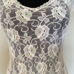 Vintage Cine Star long nightgown in excellent condition. White with cap lace sleeves and lace upper body, plus subtle sparkles on the lace.