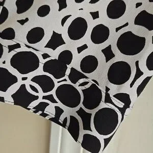 A flattering black-and-white abstract blouse with subtle ruching—easy to wear, polished for work, and comfortable enough for all-day confidence.