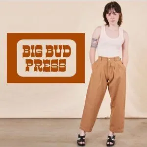 The classic pleated Trouser. One of our best-selling pants. The perfect pant. Made with our signature 9oz 100% cotton twill that we use for all of our pants and jumpsuits. Plenty of room for your hips in our trousers--your butt is gonna love these. Excess fabric in the hip provides for a beautiful drape on those of us with narrower hips. Double-pleated. Big front pockets. Our twill does not have stretch built into the fabric but all of our pieces break in beautifully with wear and conform to your body with time! 100% Durable 9oz Cotton Twill Preshrunk Double Pleated Elastic Waist In Back Large Front Pockets YKK Zipper Gold Sun Baby Logo Button Enclosure Garment Dyed