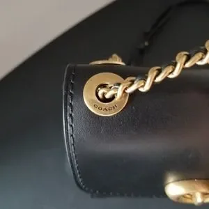 Elegant black backpack with gold chain accents. Sleek design. Perfect for any occasion.