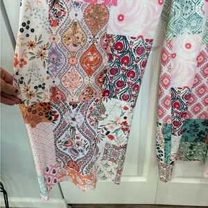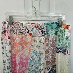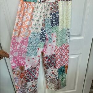 Vibrant patchwork wide-leg pants with a mix of patterns. Features pink, green, blue, and white colors.