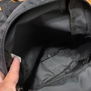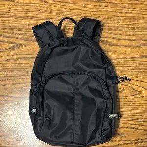 This sleek black backpack is perfect for women on the go. Its stylish design and practical features make it an ideal choice for daily use. Light weight, small, 12” tall and 10” wide and 3” deep. Small seam loose on interior pocket. Used, very good condition.