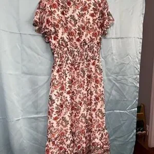 Charming midi dress with floral pattern. Features ruffled sleeves and a flattering fit.