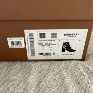 Elegant Burberry ankle booties with iconic check pattern. Sleek black leather design. Perfect for stylish outings.