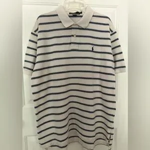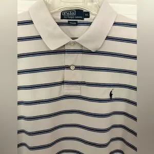 Polo by Ralph Lauren Menโs short sleeved polo shirt in ivory, blue, and black in size XL.