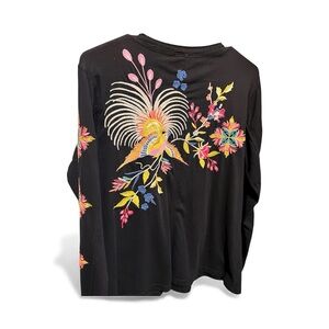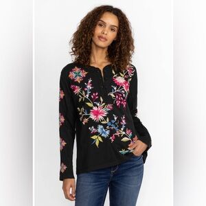 Johnny Was Julie Raw Seam Henley Top Black Floral Embroidered Small