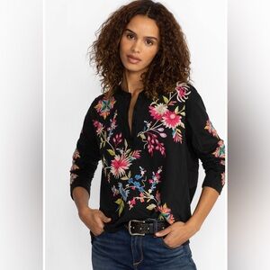 Johnny Was Julie Raw Seam Henley Top Black Floral Embroidered Small. Excellent used pre owned condition.