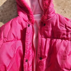 Hood is lined with soft, warm, fleece like material and edged with pink faux fur for cute detail.