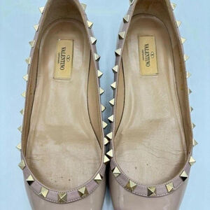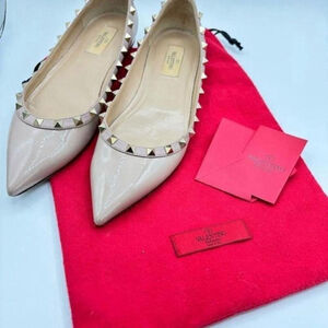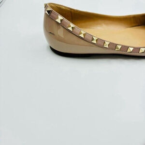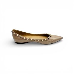 Valentino Beige Rockstud Patent leather flat. In great Condition. There is wear on bottom but lots of life left in them. (shown in photo). Small scuff mark on shoe also shown in photos. 100% authentic Size 39 No Box. Includes dust bag and rivets.