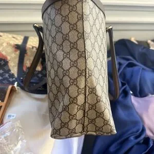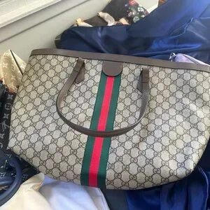 Stylish Gucci tote with iconic green and red stripe. Beige and brown design. Perfect for everyday elegance.not verified as authentic