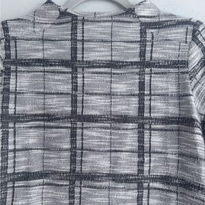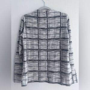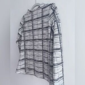 Stylish plaid top with black and white design. Perfect for casual wear. Lightweight. Soft texture, 57% polyester, 43% cotton. Put to put measures 19”.