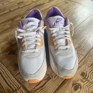 Nike Air Max 90. Men’s size 12. White with purple and tan details. Comfortable and stylish. Smoke free, pet friendly home. All orders ship in 1-2 business days!