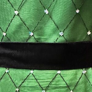 Elegant green maxi dress with black mesh overlay. Features a sequin diamond pattern with subtle sparkle. Perfect for evening events.