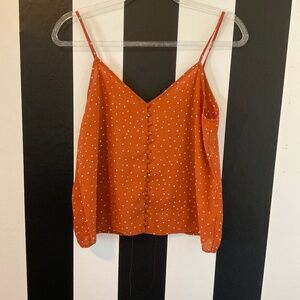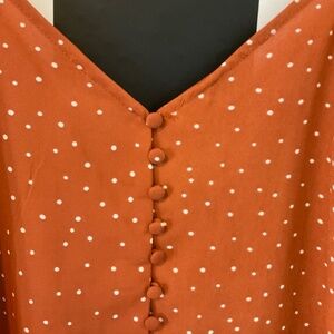 Sleeveless rust ore polka dot tank. This beauty would be perfect with your favorite pair of jeans.