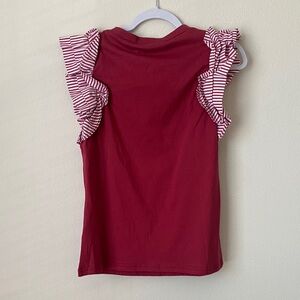 This vibrant red top features playful ruffle sleeves with a charming striped pattern. Perfect for adding a pop of color to any outfit.