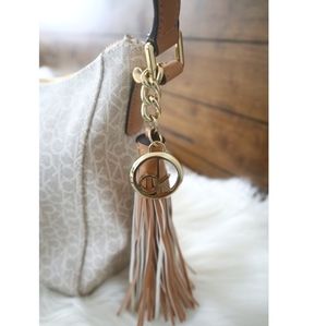 This Calvin Klein monogram tassel boho bag is a lovely style.Alm Khaki/ Luggage/ Gold color. Zip top closure. Medium size. Top handle. Imported. Has a strap to convert this shoulder bag to a crossbody bag. Very stylish with the cute tassel. Autentic. Brand new! ( NWT) All reasonable offers are welcome! 😊