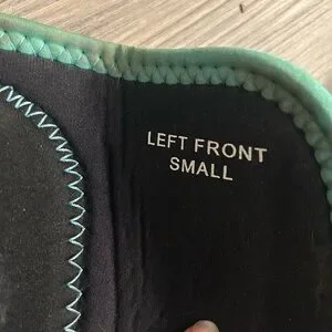 Teal and black. Small fronts, medium hinds. Lightly used great condition, freshly washed and air dried. Some discoloration on hind Velcro is more noticeable but Velcro is all in perfect condition.