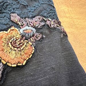 Free People Secrets of Eden Mini Dress Black Beaded Embroidered Lace. Size S. Bodice 100% nylon. Skirt 49% cotton, 47% viscose, 4% spandex. There is some wear to the embroidery.