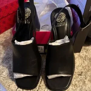 Chic black open-toe heels by Vince Camuto. Sleek design with adjustable strap. Approximately 3 inch heel.