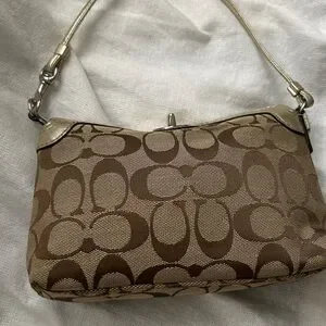 Chic Coach shoulder bag with signature pattern. Features tan and gold tones. Perfect for stylish outings.