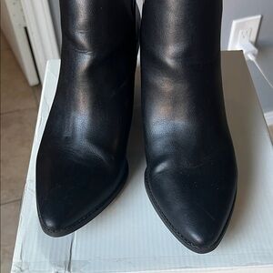 Chic black ankle booties with a stylish knotch cut. back zipper for easy on/off. square heel about 3 inches tall. almond toe. perfect fall staple. synthetic material