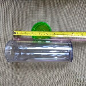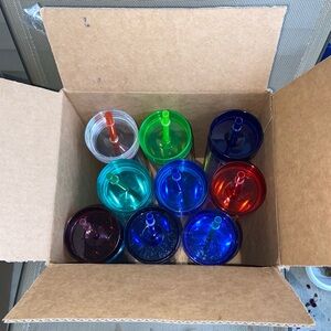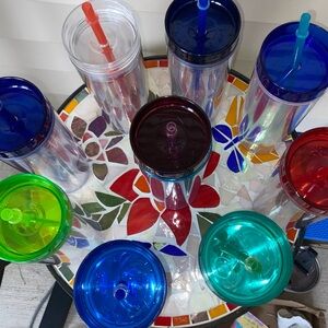 Nine various colors and brands of vibrant plastic tumblers with straws, both hand washable. Includes mixed and matched colors and brands. Perfect for any occasion!