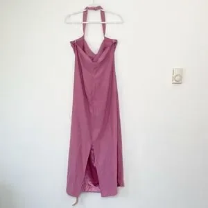 Elegant pink midi dress. Halter neckline. Sleek silhouette. Perfect for special occasions.
