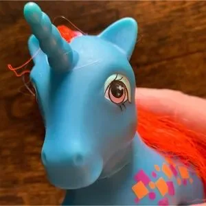 Blue unicorn pony with fluorescent orange hair w/purple streak and orange and purple shapes cutie mark. Some play wear as seen in photos.