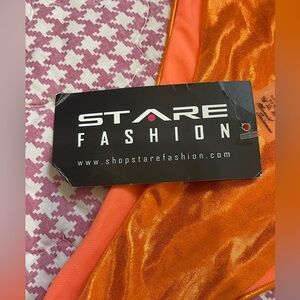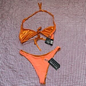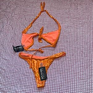 Turn heads with the Orange Shimmer Bikini Set. This eye-catching swimwear features a bold orange hue, perfect for standing out at the beach or pool.