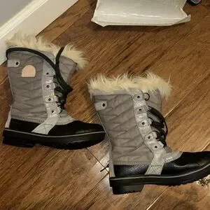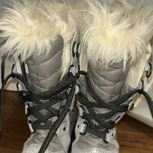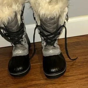 EUC SOREL LACE UP WINTER BOOTS. Size 5Y=6.5WOMENS. Sparkly silver and gray with black toe & sole. Black laces with cream colored fur around the top. Beautiful boots!! I wish I could have kept them but they are to small.