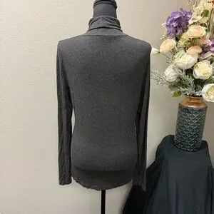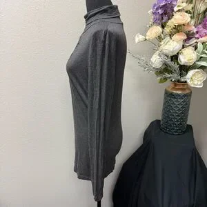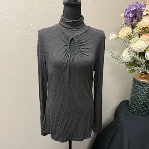 Chic and modern, this Spense charcoal gray mock neck top (Size M) features a flattering front keyhole cutout, long sleeves, and a soft stretch fabric blend for comfort and style. Perfect for fall layering, office wear, or evening outings, this versatile piece transitions seamlessly from day to night. A timeless dark neutral makes it easy to pair with jeans, skirts, or trousers.
