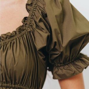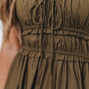 GARMENT DETAILS: Elegant maxi dress in 100% cotton, with short puffed sleeves, tiered and gathered bodice with adjustable tie detail, and ruffle accents throughout. Finished with a full lining. Elasticated neckline can be worn on or off the shoulders.