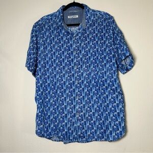 Tommy Bahama Blue Palm Print Casual Button Hawaiian Tropical Shirt Size Large
