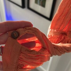 Orange cotton (100% cotton). Top. Long sleeve. V-neckline. Front buttons. Fully lined. 21" from shoulder to hemline. Imported.
