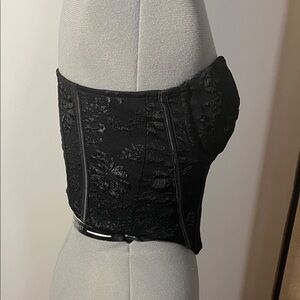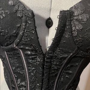 Chic black bustier with floral design. Perfect for stylish layering. Comfortable and elegant.