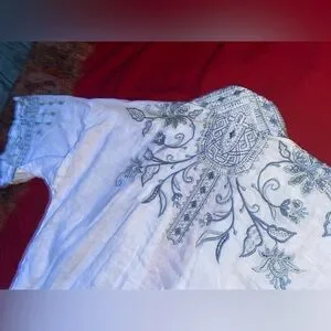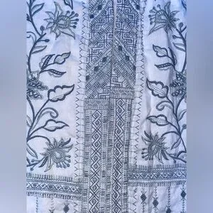 White with embroidery in different shades of blue / sea green.. beautiful colors