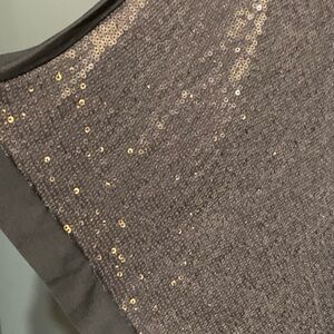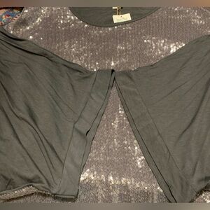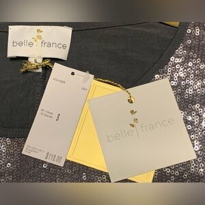 Shirt by Belle France. Beautiful drop shoulder shirt with silver sequin on the front and a dark grey back. It has a rounded neckline and is very loose fitting with flowy wide sleeves. It is a great shirt for any occasion. You can dress it up for a holiday party or dress it down with a pair of jeans. This is NWT. Never worn. Color is grey/silver. Size is S.
