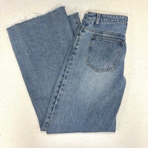 Size M. Relaxed fit blue jeans from Edikted. Lace trim on waist. Wide leg.