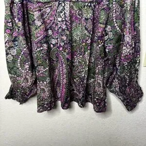 Stylish paisley blouse with ruffle details. Features a mix of pink, green, and black. Perfect for versatile wear.