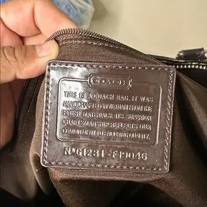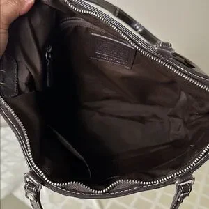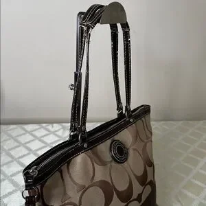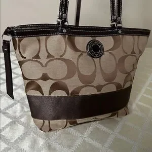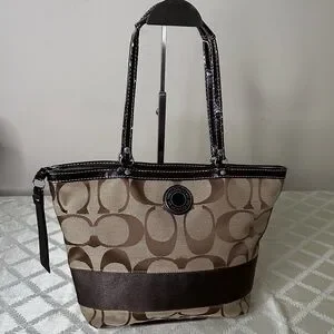 Stylish Coach tote with signature pattern. Features tan and brown colors. Perfect for daily use.